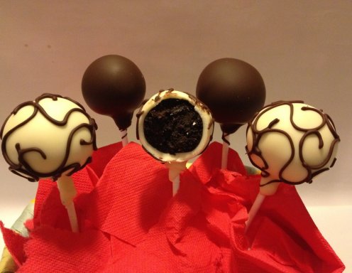 Währendessen etwas Kuvertüre schmelzen. Nach der Kühlphase die Stiele ca. 1 cm breit in die Schokolade tunken und schön mittig in die Kuchenkugeln stecken. Die Cake Pops erneut ca. 30 Minuten in den Kühlschrank (oder 10 Minuten in den Gefrierer) stellen. Die restliche Kuvertüre schmelzen (Achtung: sollte nicht zu heiß sein, aber flüssig) und die Cake Pops komplett in die Kuvertüre tunken, sodass sie komplett glasiert sind.
